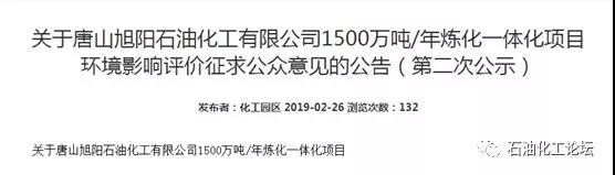 近日,唐山旭陽石油化工有限公司1500萬噸/年煉化一體化項目環評二次公示正式展開。 據環評報告(征求意見稿)顯示,項目建設地點位于河北省唐山市曹妃甸工業區,建設單位為唐山旭陽石油化工有限公司,由旭陽集團旗下的旭陽控股有限公司于2017 年1 月出資成立。項目建設周期36個月。